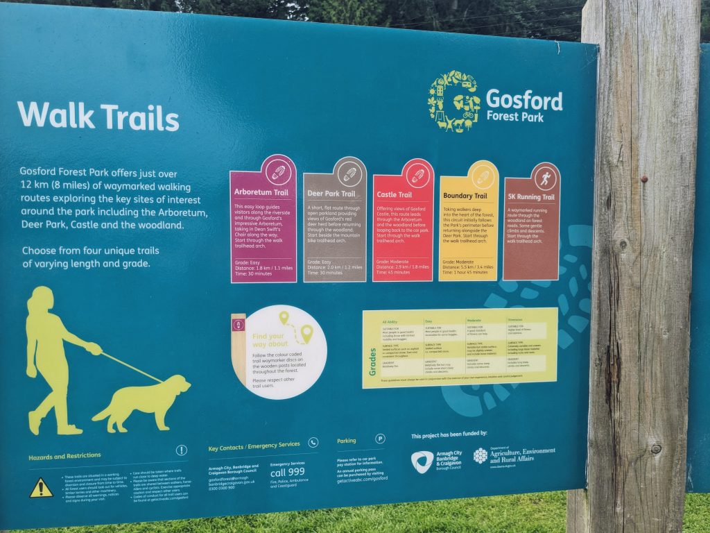 Le parc forestier de Gosford est situé dans le sud du pays. Il y est proposé cinq circuits de marche que vous pouvez retrouver sur la carte ci-dessous. Je vous conseille de passer par le circuit rouge appelé « Castle Trail » de 2,9 km. Vous pourrez y voir les jardins du parc et vous balader autour du château de Gosford.